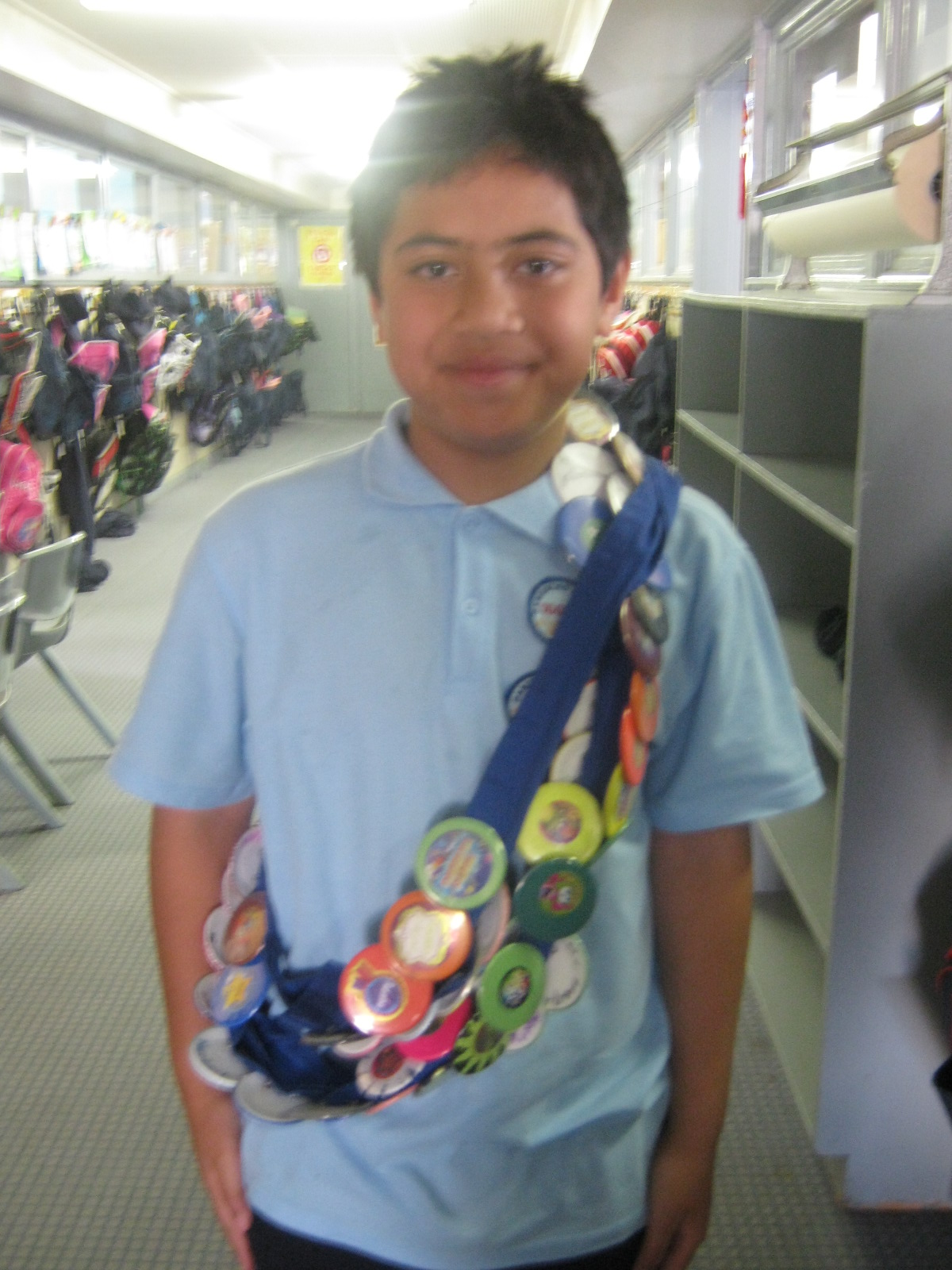 At each assembly students with badges are asked to stand up and two winning numbers are chosen. The lucky students with that number of badges get to choose from a range of prizes.